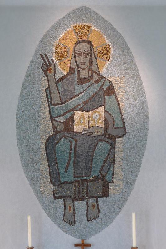 Das von dem Maler Georg Schmidt-Westerstede, entworfene und ausgeführte Mosaik in der Wand hinter dem Altar macht die Botschaft von Christi Himmelfahrt, hier ausgesprochen in Worten des Hebräerbriefs, anschaulich.